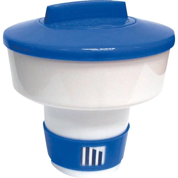 Vlotter voor chloortabletten van 200 gram. Met een eenvoudige draairing onderaan de vlotter, regel je de hoeveelheid vrij te geven chloor in het zwembadwater.