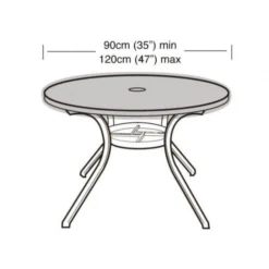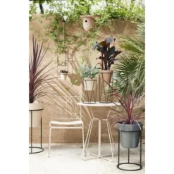 De ronde bistrotafel Leandro heeft een zwart metalen onderstel en een bovenblad met het uitzicht van een rieten bekleding.