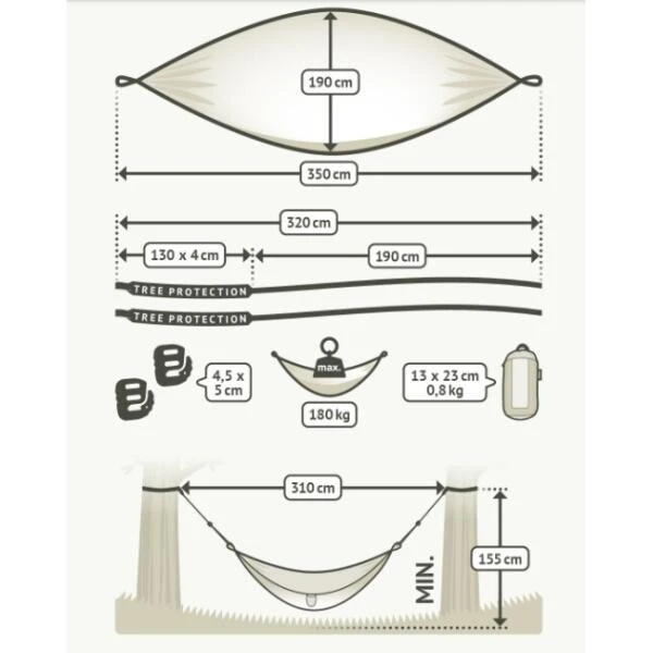Een reishangmat gemaakt uit een lichte nylon stof die zeer comfortabel aanvoelt. Met de voorziene boomriem en ophanghaken is de hangmat eenvoudig en snel te bevestigen.