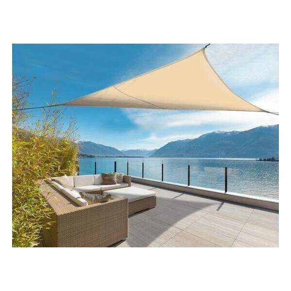 Een driehoekig zonnescherm dat bescherming biedt tegen zonnestralen en op die manier voor een leuke plek in de schaduw zorgt.