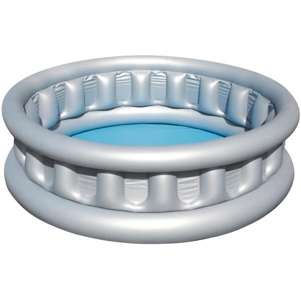 Op warme zomerse dagen is er niets leuker dan plonsen en ravotten in het zwembad in de tuin. Dit opblaasbare zwembad met ronde vorm van een ruimteschip is ideaal voor kinderen en dankzij de praktische afmetingen past het ook in kleine tuinen. In dit zilveren zwembad zorgt een aftapkraan voor een vlotte afwatering wanneer je het zwembad leeg wil maken.